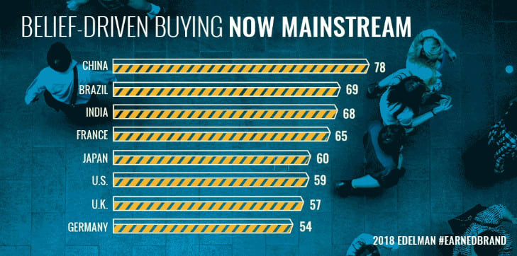В 2018 году компания Edelmen опросила 40 000 человек в 8 странах : Бразилии, Китае, Франции, Германии, Индии, Японии, Великобритании и США. Компания выявила, что 64% респондентов выбирает или отклоняет товары в зависимости от политических или социальных взглядов компании-производителя.