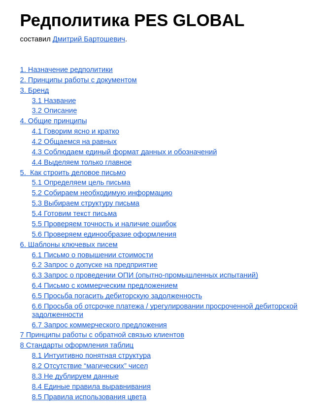 Оглавление редакционной политики PES GLOBAL — более 30 страниц стандартов деловой коммуникации.